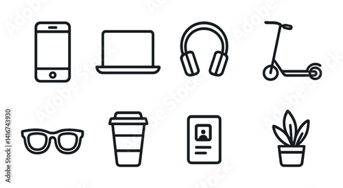 Modern life essentials: smartphone, plant, and coffee mug on white background