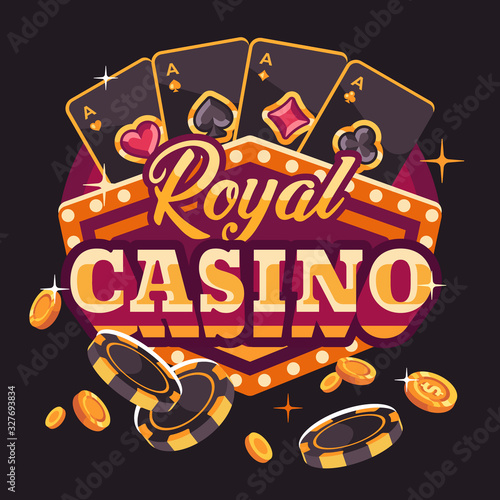 Vector illustration on a casino theme with color playing chips and poker cards on dark background.