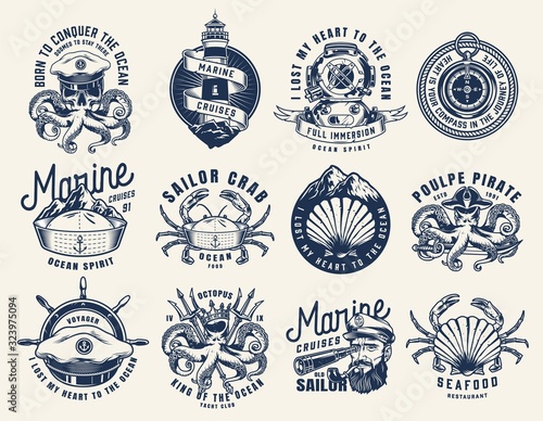 Nautical and marine labels with octopus isolated illustration. Emblem for t-shirts.
