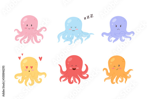Cute cartoon octopus character expressions set, happy angry sad surprised emotions, marine sea animal vector, funny underwater creature design