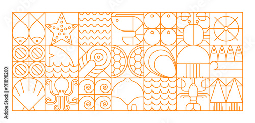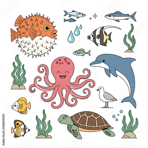 Colorful sea creatures graphic design elements featuring whale jellyfish seahorse octopus and fish marine life concept with coral and abstract seaweed isolated on white