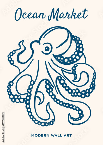 Blue octopus under the sea. Cartoon vector illustration. Banner invitation for underwater show. Sea cute animal.