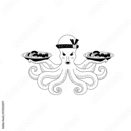 Intricate octopus illustration with fork: detailed tentacles and intricate design.
