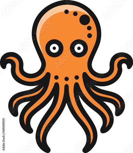 Smiling Octopus Illustration: A friendly blue and orange octopus with a toothy grin and eight tentacles smiles cheerfully at the viewer in this cheerful cartoon illustration.v