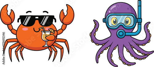 Funny octopus cartoon characters vector illustration. For kids coloring book.