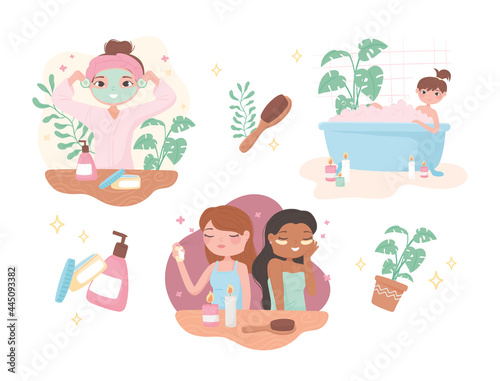 Spa Day Essentials. Flat vector mini-illustrations spa day essentials in colors children's illustrations: