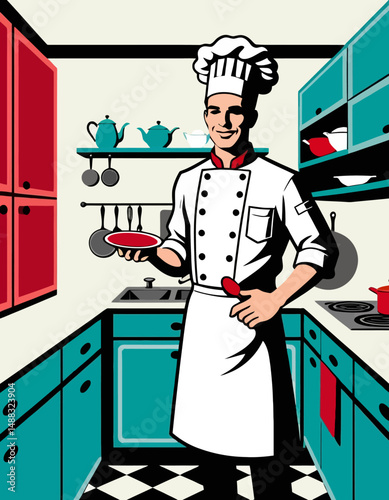 Chef Preparing a Meal in a Bright Kitchen Illustration