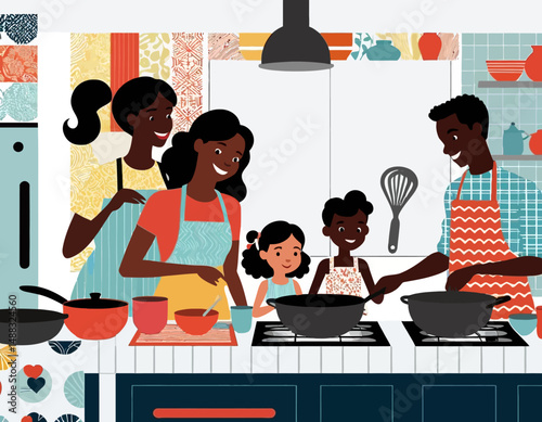 Family cooking moments in modern kitchens with isometric design