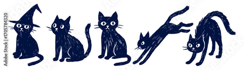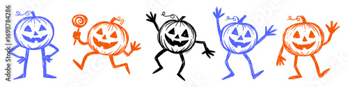 Happy Halloween. Vector cute childish naive illustrations of characters, pumpkin, black cat, funny monster, ghost, witch, logo for greeting card, sticker, icon or sign
