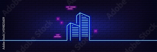 Neon light glow effect. Skyscraper buildings line icon. City architecture sign. Town symbol. 3d line neon glow icon. Brick wall banner. Skyscraper buildings outline. Vector