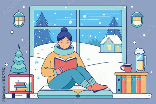 A cozy winter scene with a woman reading by the fireplace, a cat on a pillow, and snow falling outside the window, creating a warm and inviting atmosphere