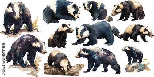 Cute badger Character. Cute woodland animals collection. Hand drawn vector illustration set badgers, forest animals, trees, mushrooms isolated
