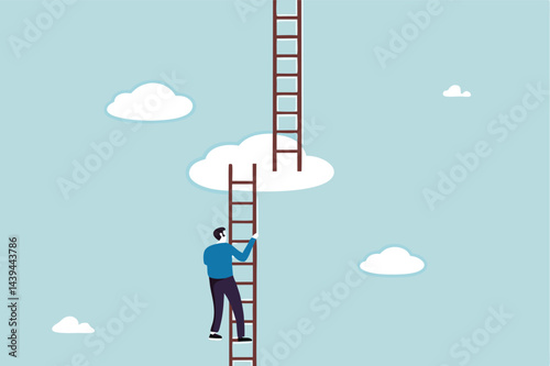 Progress to the next level, upgrade business to achieve better quality, growth concept evolve, ambitious entrepreneur climb ladder to cloud level to reach next level.