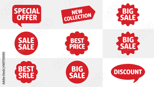 Big Vector set of promotional red labels and badges. Includes sale, discount, and special offer label collections. Vector illustration.