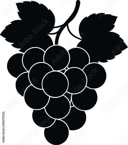 Grapes black silhouette icon isolated on white background, black cluster of round fruits with single leaf, dark stylized image of fresh healthy organic food