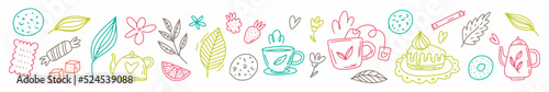 Tea party pattern, tea set. A sketch. Vector illustration of doodles.