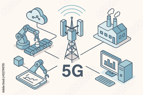 Isometric illustration of a futuristic automated production line featuring robotic arms, conveyor belts, and human workers interacting with advanced technology and digital interfaces, representing