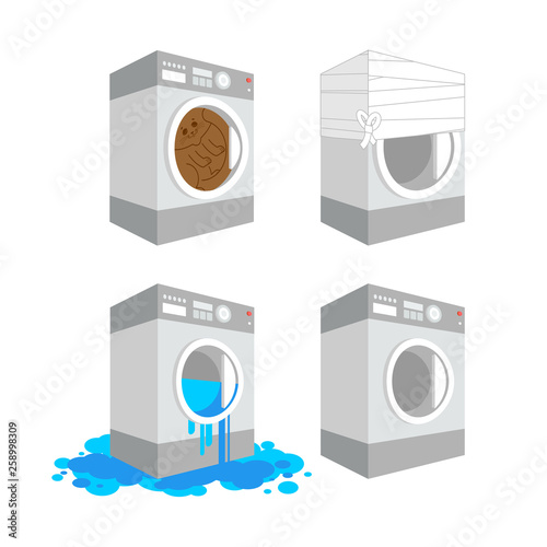 Repair of household appliances landing page. Washing machine on background of leaves. Broken washing machine with water on floor. Household appliances in need of repair. Flat vector illustration.