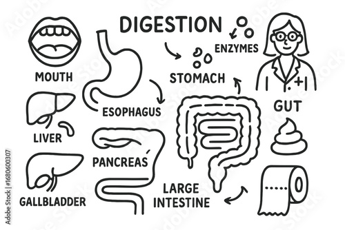 Digestive System Doodle. Hand-drawn doodle illustration digestive system mouth, esophagus, stomach, small intestine, large