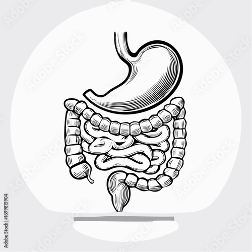 Hand-drawn monochrome sketch of human digestive system with stomach, small and large intestines, highlighting internal organs for digestion