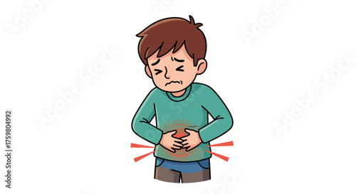 Cartoon Boy Experiencing Abdominal Pain, Clutching Stomach with Discomfort and Nausea in a Doctor's Office, Illustrating Illness, Sickness, Gastroenteritis, or Digestion Problems for Healthcare Market