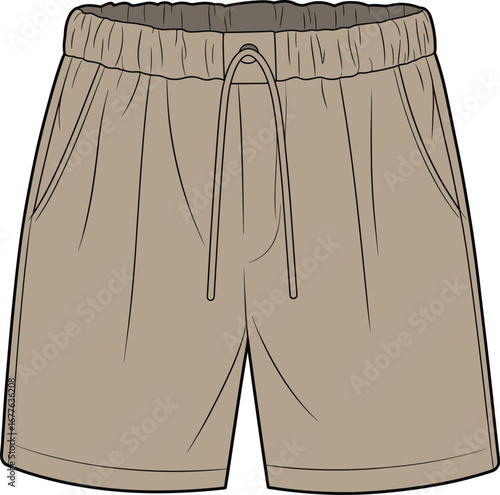 Men's basic elastic waist shorts vector illustration, front flat sketch for casual wear, drawstring detail, technical fashion CAD design