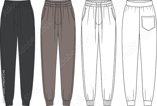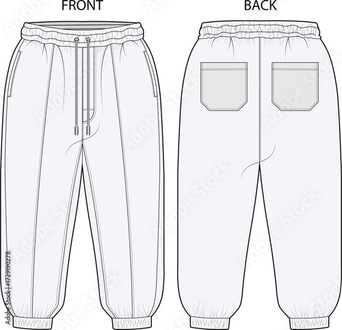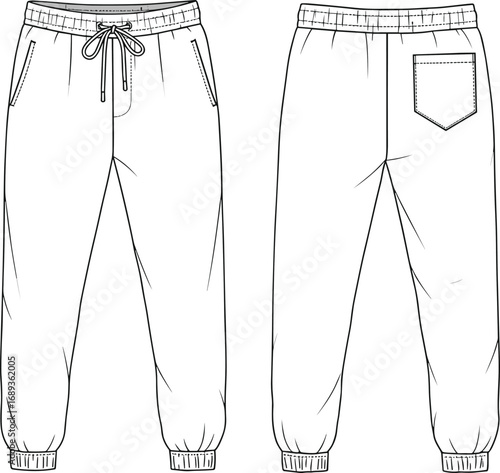 Jogger pants technical illustration, fashion flat sketch, front and back view, apparel design template, elastic waistband, drawstring, patch pockets, tapered cuffs