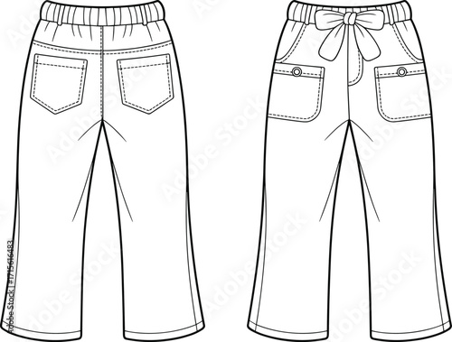 Technical fashion vector illustration of children’s pants with elastic waistband, bow detail, patch pockets, cuffed hem, garment construction and stitching details