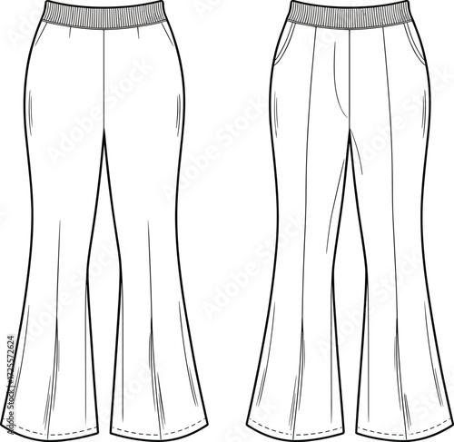 Vector fashion illustration of women flared pants with elastic waistband, side pockets, front darts, curved hem, technical garment sketch