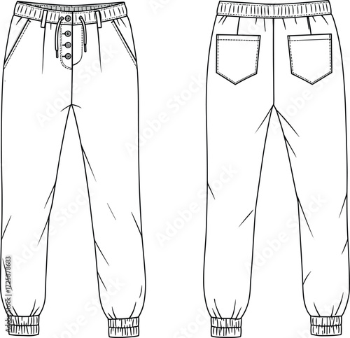 PrintFashion flat sketch, jogger pants design, elastic waistband with drawstring, button fly front, back patch pockets, modern casual apparel illustration template
