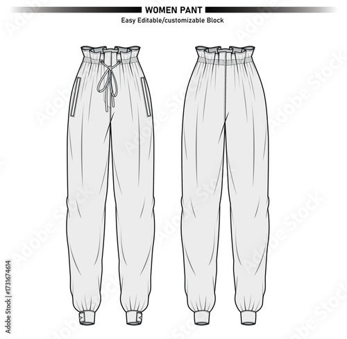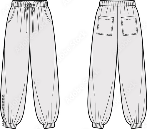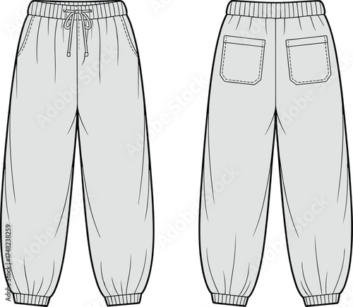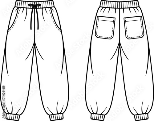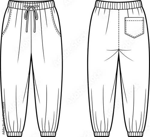 Harem pants front and back view, elastic waist and ankle, loose fit joggers fashion cad, vector sketch drawing