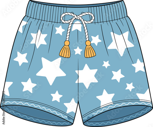 Blue star-patterned shorts, elastic waistband with drawstring tassels, playful fashion design, children’s summer garment, casual wear illustration, stylish textile concept