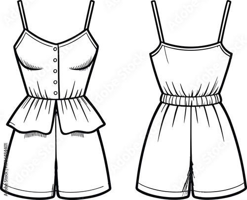 Fashion sketch, women romper design, black and white illustration, sleeveless outfit, spaghetti strap, peplum waist, elastic waistband, stylish shorts, apparel template, clothing concept
