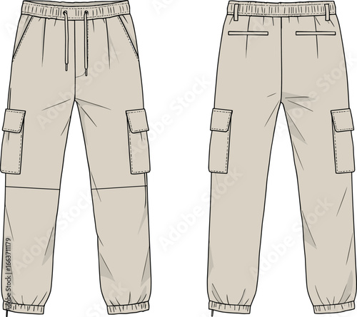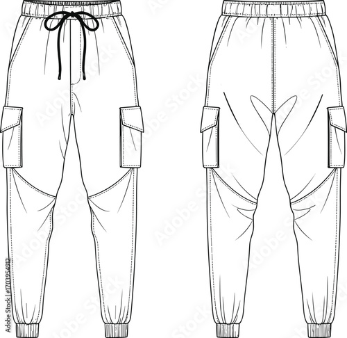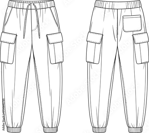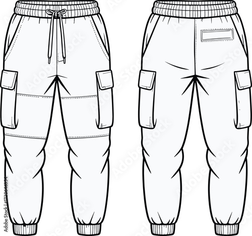 Cargo jogger pants fashion sketch, technical drawing front and back, vector illustration, elastic waistband, pocket design, cuffed hem, clothing template, flat fashion art