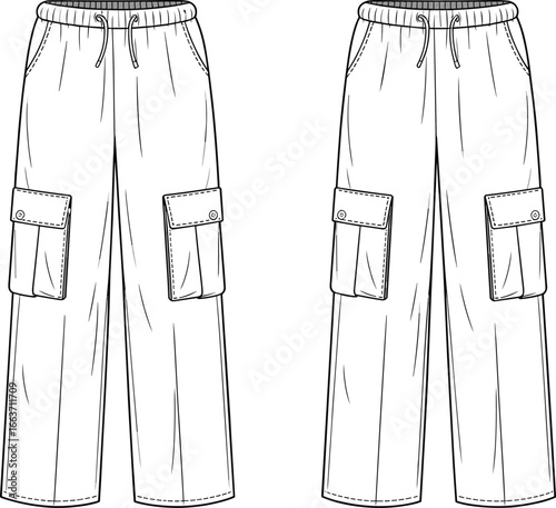 Vector technical flat sketch of unisex cargo pants with wide leg, elastic waistband, flap pockets, button closures, front and back view