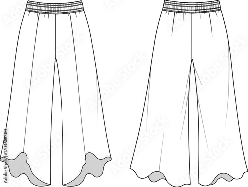Wide leg pants technical sketch, scalloped hem, elastic waistband, front and back view, fashion flat, cad drawing flat vector illustration