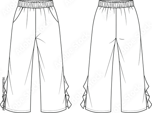 Cropped pants technical sketch, front and back view, ruffle side seams, elastic waist, fashion flat, cad drawing flat vector illustration