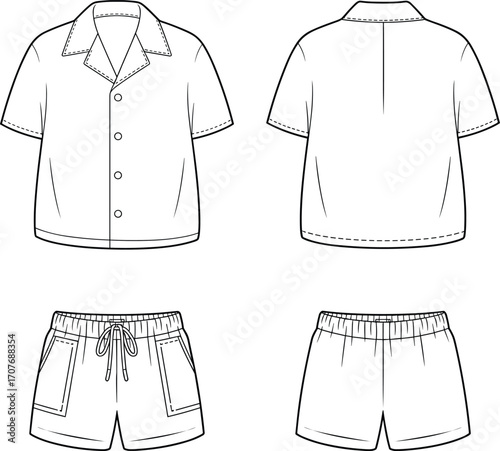 Men's casual summer outfit, short sleeve shirt and shorts, elastic waistband, front and back views, fashion flat sketch illustration