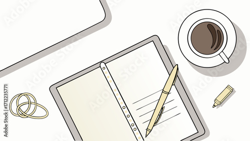 Flatlay illustration of workspace with notebook pen coffee and laptop.