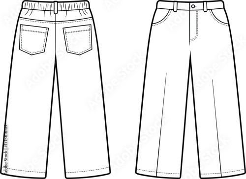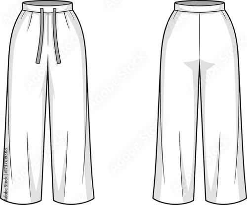 Flat vector fashion illustration, wide leg pants, high waist trousers, elastic waistband, drawstring tie, front back view, technical clothing design