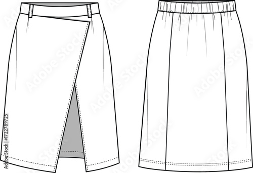 Wrap skirt vector cad drawing, flat technical fashion sketch, front back view, modern design, elastic waistband, apparel illustration