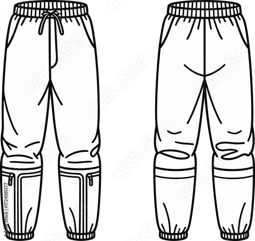 Jogger pants front back, elastic waist drawstring, ribbed cuff hem, CAD flat sketch, fashion vector illustration, garment technical drawing