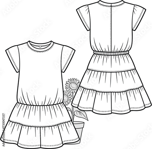 Casual tiered dress fashion flat sketch with short sleeves and elastic waist, front and back views, female garment design template