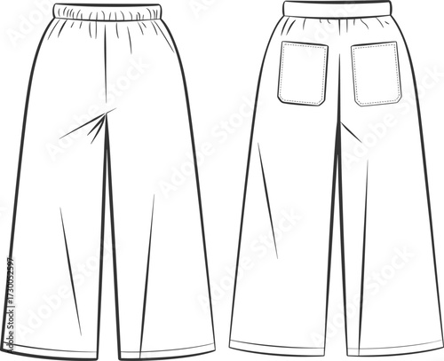 Flat vector CAD sketch of wide-leg elastic waist pants with back patch pockets, front and back technical clothing illustration.