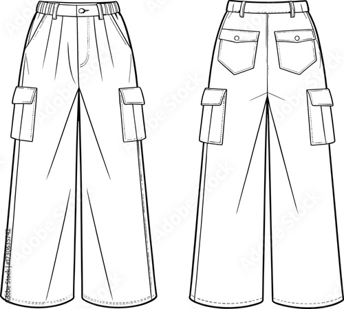 Vector fashion technical flat illustration of wide leg cargo pants with button closure, belt loops, flap pockets, elastic waistband, seam details
