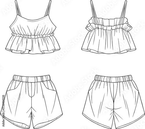 Fashion sketch, women two piece outfit, black and white illustration, sleeveless top, ruffle bust, flared hem, elastic shorts, side pockets, relaxed fit, garment template