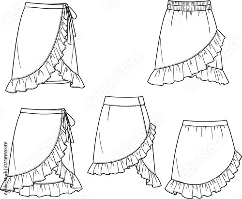 Set of women skirt flat fashion sketches with wrap style, ruffle hem, elastic waist, technical drawing, vector CAD apparel design templates