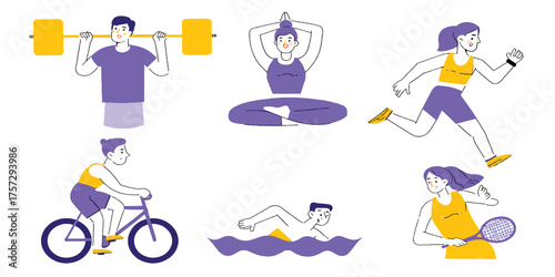 Silhouettes of diverse athletes engaging in various exercises, including running, weightlifting, and yoga poses.