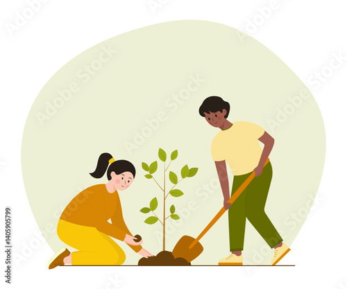 Sustainability concept, woman and man planting young tree in the garden, Vector