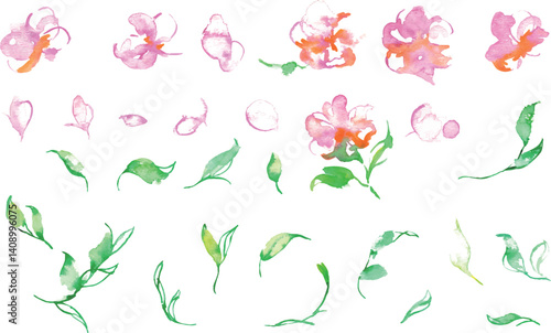 水彩画。水彩タッチのベクターピンクの花イラスト。草木のベクターイラスト。花の切り取りセット。Watercolor painting. Vector pink flower illustration with watercolor touch. Vector illustration of plants and trees. Flower cutout set.